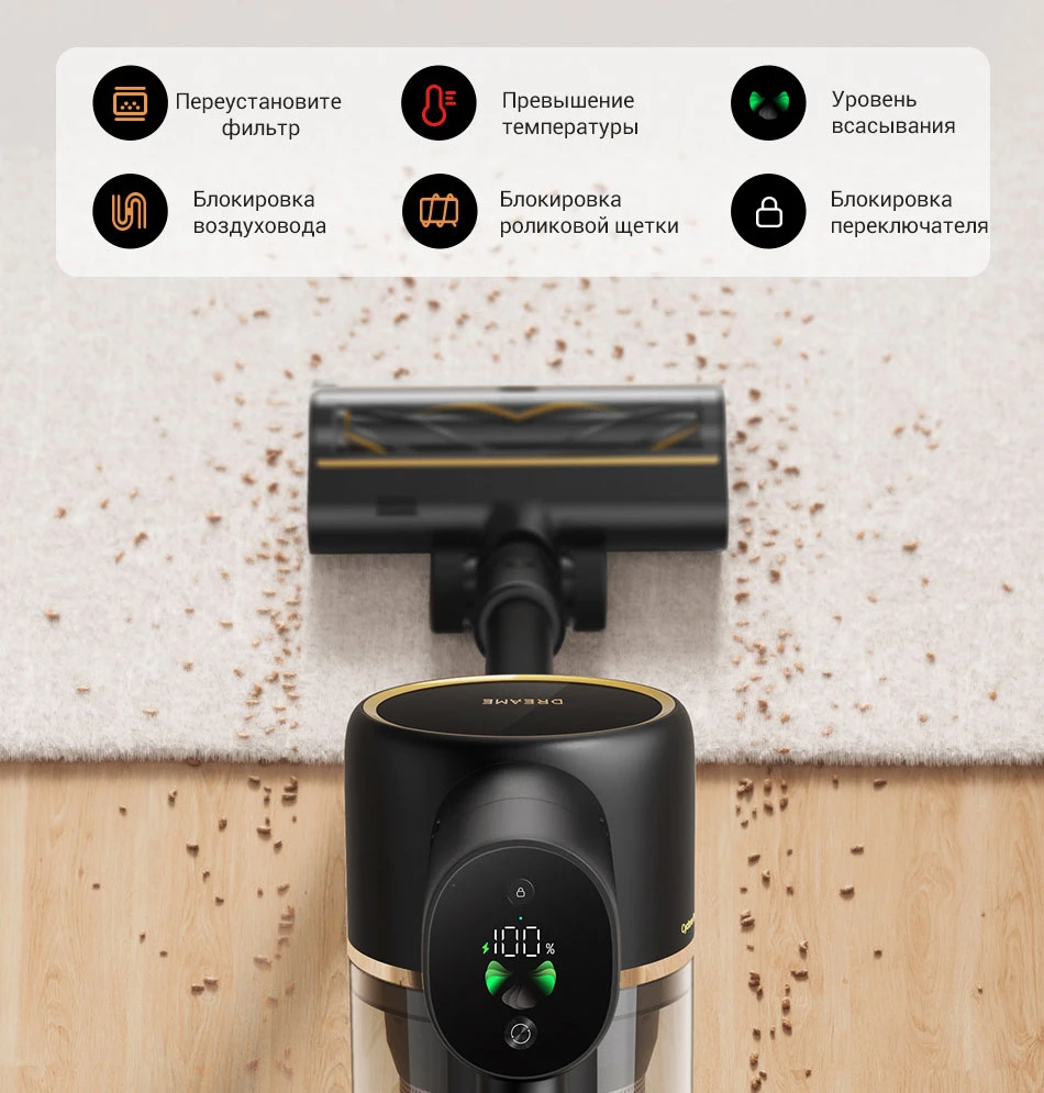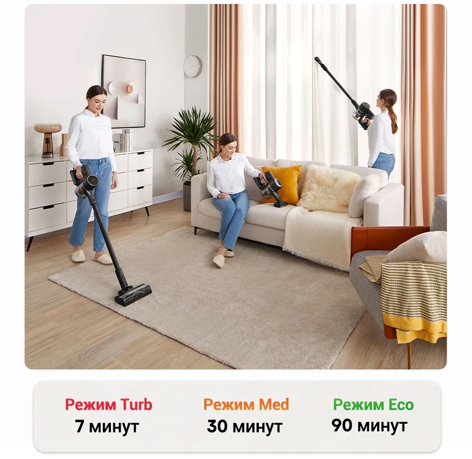 Эффективность уборки достигается благодаря высокоскоростному бесщеточному двигателю, обеспечивающему мощность всасывания 150 аэроватт (20000 Па) и надежное удаление волос, грязи, пыли и мелкого мусора.